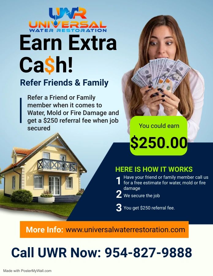 Refer a friend of family and receive a Universal Water Restoration $250.00 gift card. Our experienced team is equipped to handle any fire or water damage emergency. Call us Now.
